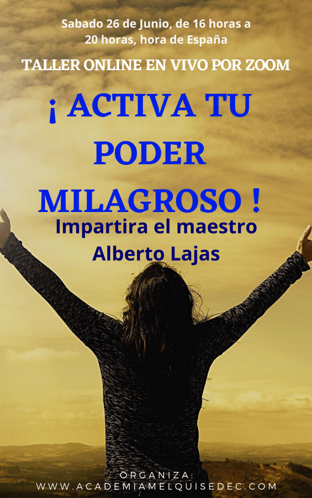 El próximo 26 de Junio, el maestro Lajas impartirá por segunda vez el taller en vivo por zoom “ Activa tu poder milagroso”. Un taller practico de unos cuatro horas de duración donde vas a aprender porque no están ocurriendo milagros en tu vida. Son decenas y decenas de personas las que ya han comenzado a experimentar milagros en sus vidas gracias a este taller, ahora El Universo te busca a ti.